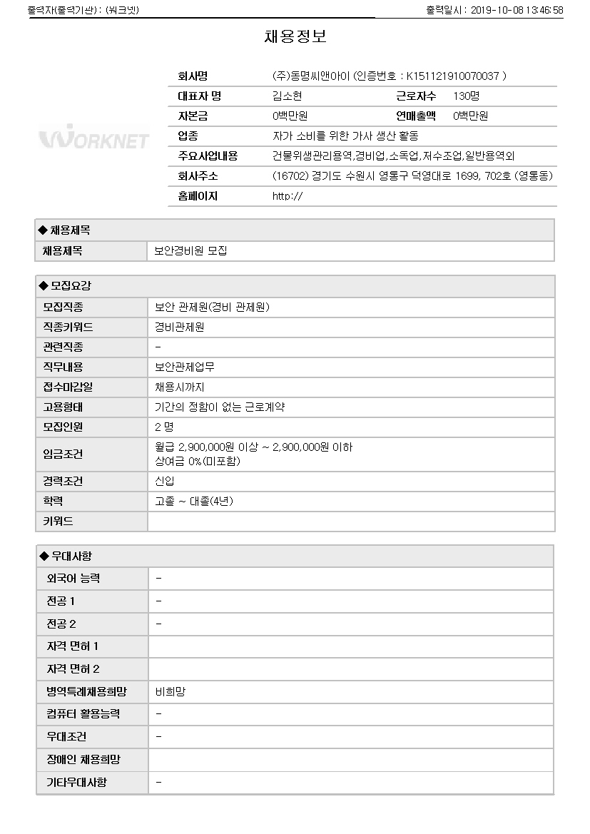 (워크넷)[영통구/신동] 아파트경비원 모집