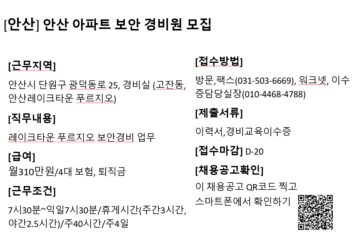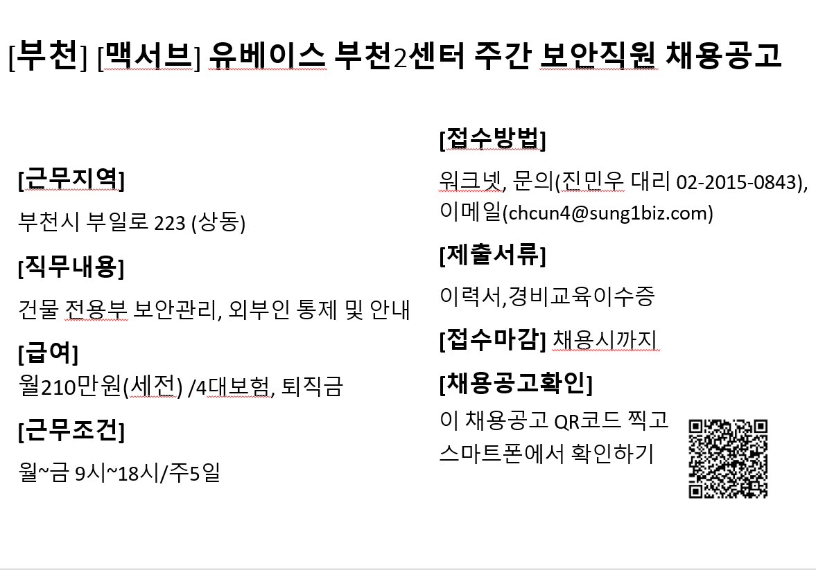 ※ 담당자 연락처(이름/전화번호/이메일주소)는 오로지 구직목적으로만 활용가능하며, 이 외의 목적으로 활용 하실 경우 처벌받을 수 있음을 알려드립니다.
