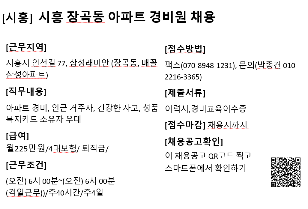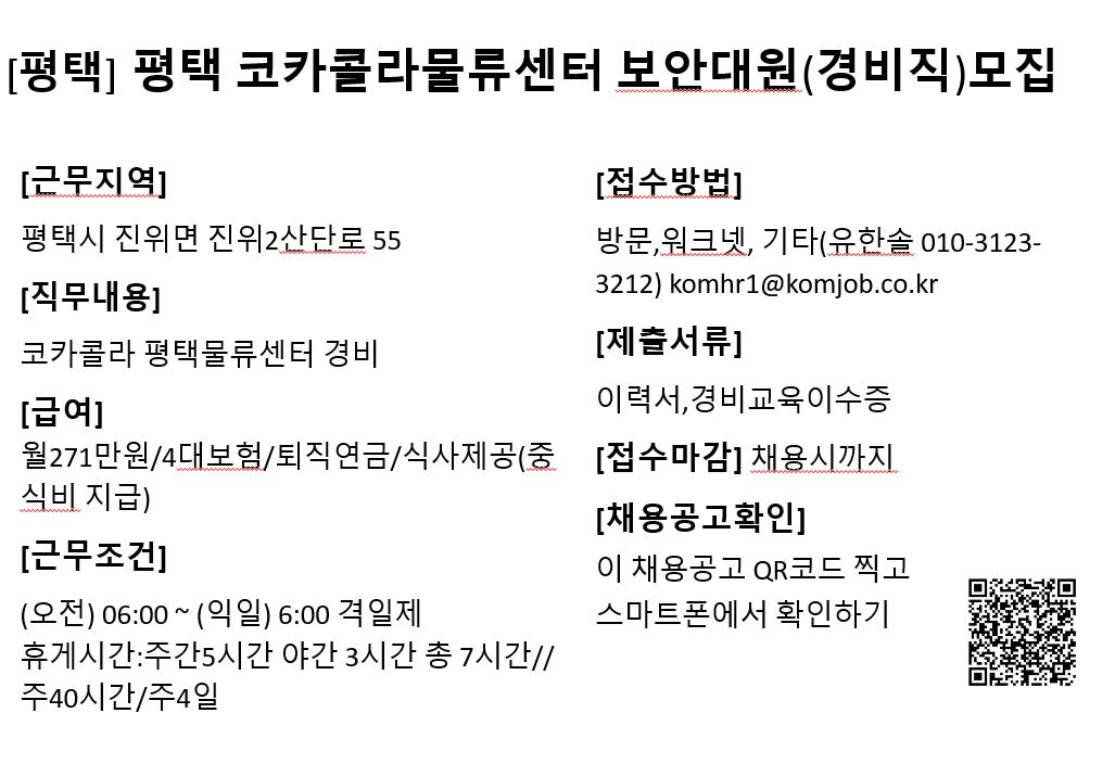 ※ 담당자 연락처(이름/전화번호/이메일주소)는 오로지 구직목적으로만 활용가능하며, 이 외의 목적으로 활용 하실 경우 처벌받을 수 있음을 알려드립니다.