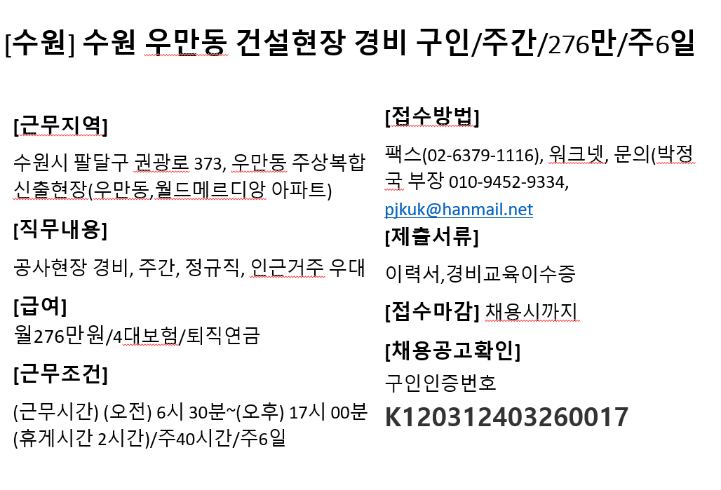 (워크넷) 2024/04/18 일자 경비,보안 분야 구인공고 공유