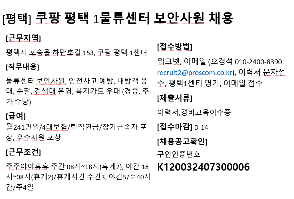 (워크넷) 2024/07/30 일자 경비,보안 분야 구인공고 공유