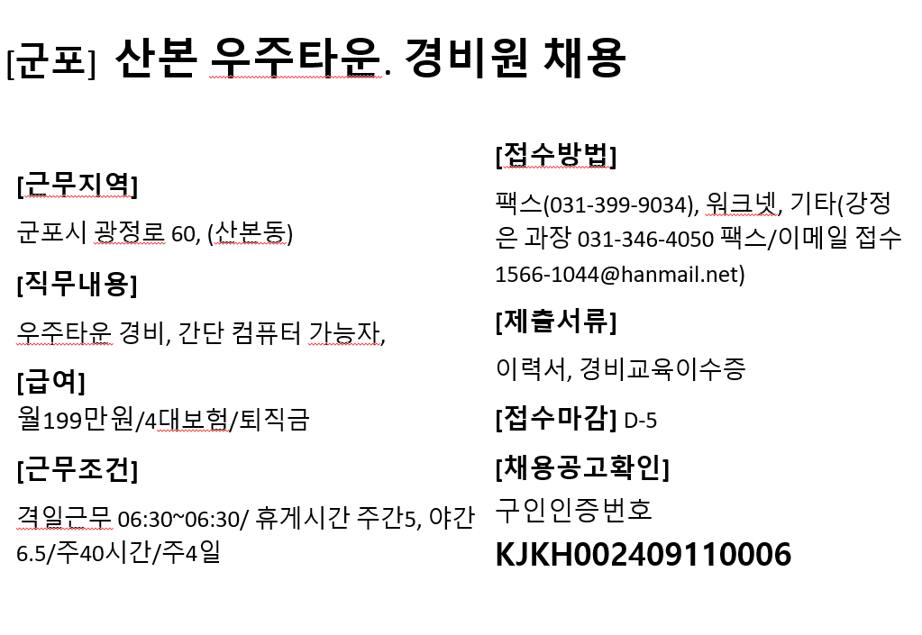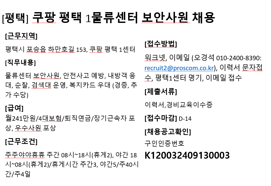 (워크넷) 2024/09/23 일자 경비,보안분야 구인공고 공유