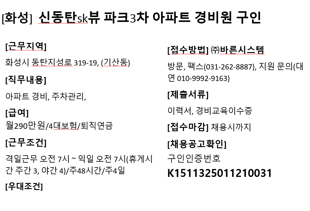 ※ 담당자 연락처(이름/전화번호/이메일주소)는 오로지 구직목적으로만 활용가능하며, 이 외의 목적으로 활용 하실 경우 처벌받을 수 있음을 알려드립니다.