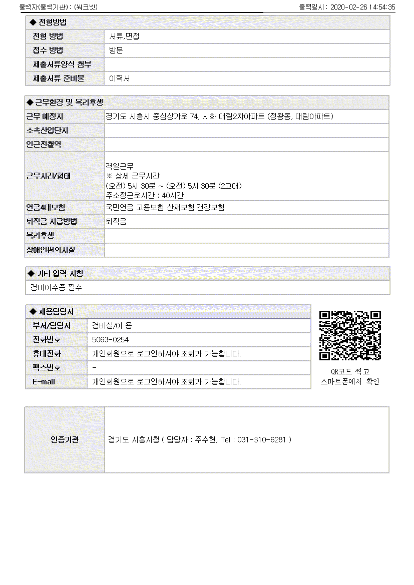 (워크넷)시흥 대림2차아파트 경비모집(경비이수증 필수)