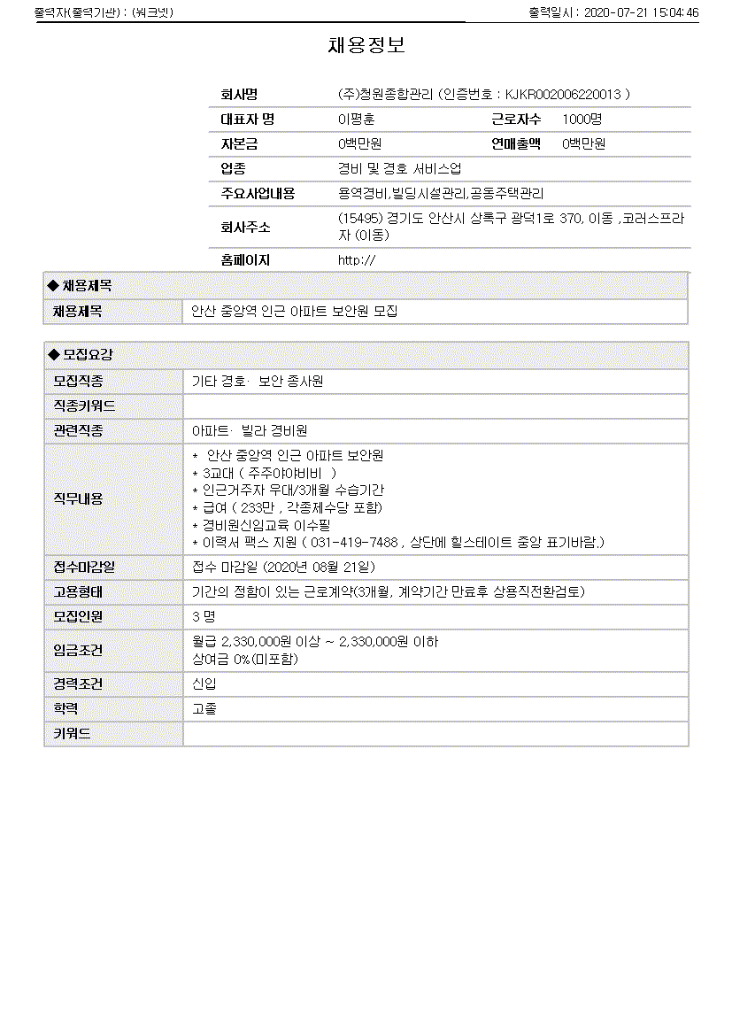 (워크넷) 안산 중앙역 인근 아파트 보안원 모집
